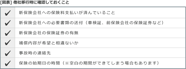 他にも、車検証や前保険会社の保険証券などの書類を送付しておくこと、新保険会社の証券があるか、事故が起きた時の連絡先といったことを、漏れがないように確かめることが重要です。